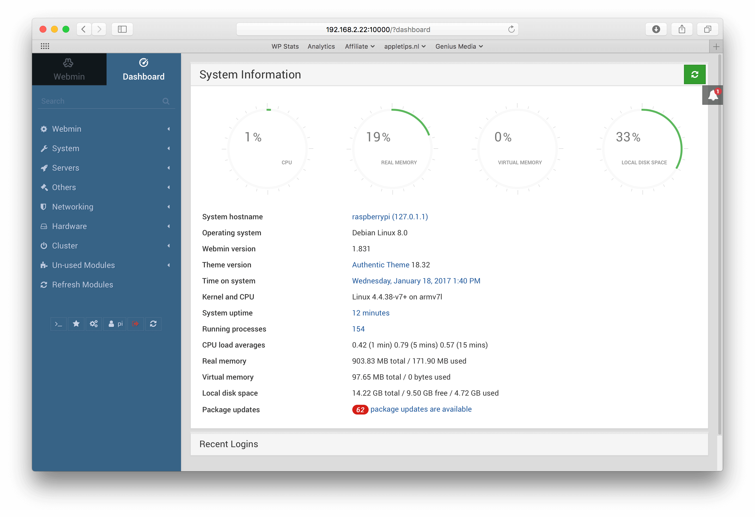 Webmin is een web interface waarmee je op eenvoudige wijze een Linux systeem kunt beheren, dus ook een Raspberry Pi waarop Raspbian is geïnstalleerd. Ben je nieuw in de wereld van de Rapsberry Pi en Raspbian dan kan de tool ontzettend handig zijn voor het beheren van het systeem.